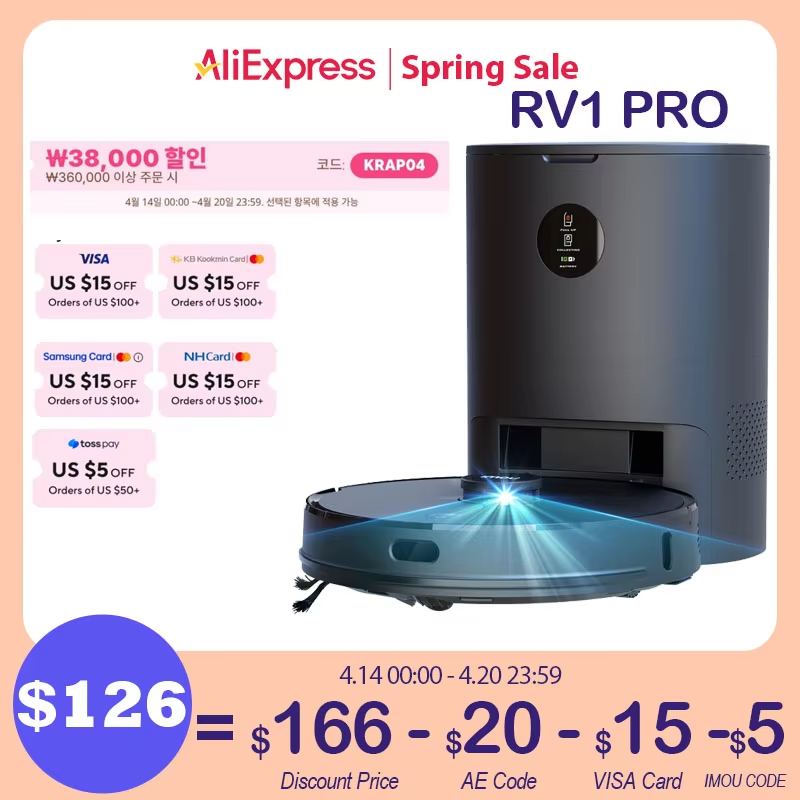 IMOU RV1 Pro 로봇청소기는 현재 알리익스프레스에서 약 248,070원에 판매 중이며, 기존가 대비 18% 할인된 가격입니다. 여기에 AE코드, 카드사 할인, IMOU 쿠폰 등을 함께 적용하면 약 126달러(약 17만 원대)까지 낮아집니다. 봄 세일과 중복 할인 덕분에 가성비가 뛰어난 시기입니다.